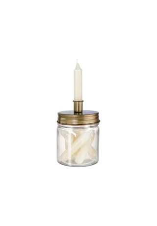 Raffiniert: Das Candle Jar Glas mit Kerzenhalter setzt dem Aufbewahrungsglas für Little Light Kerzen noch einen drauf: Auf dem Deckel aus goldfarbenem Weißbleich kann eine der sieben cremefarbenen Little Light Kerzen befestigt werden. Sobald sie abgebrannt ist, ist Nachschub ohne langes Suchen griffbereit. Ganz schön praktisch dieses 2-teilige Set – und dekorativ sowieso.