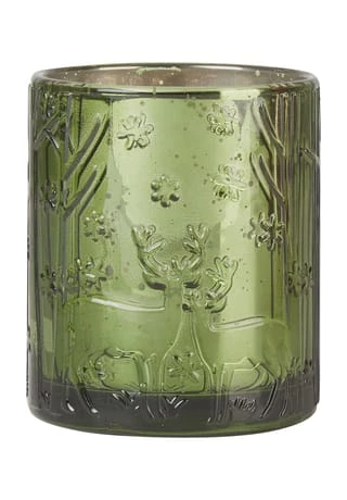 Glas ist mit winterlichem Relief von Rentieren und Schneeflocken verziert