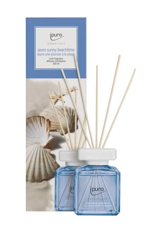 ipuro ESSENTIALS sunny beachtime. Typ: Schilfaroma-Diffusor, Material: Glas, Kunststoff, Produktfarbe: Blau, Weiß. Dufteingabetyp: Duftflasche, Hauptkopfnoten des Dufts: Grapefruit, Zitrone, Minze, Hauptherznoten des Dufts: Jasmin, Lilie, Rose. Menge pro Packung: 1 Stück(e)
