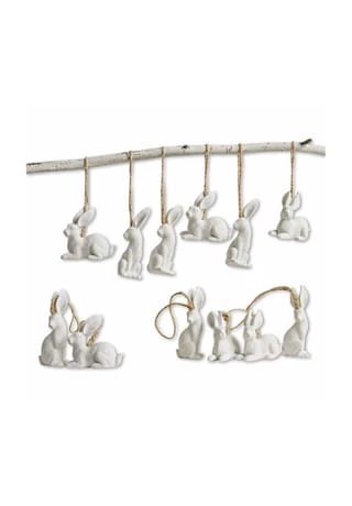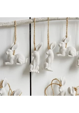 Zwölf charmante Langohren aus Polyresin. Mit hübschen Jutekordeln. Es sind sechs liegende Hasen und weitere sechs in aufrechter Position. Verschönern Sie Ihr Zuhause mit diesem zwölfteiligen Set oder verleihen Sie Ihrer Osterdekoration charmante Akzente. Sie können die Anhänger am Osterkranz befestigen oder an die Eingangstür hängen, um Freunde und Familie in Ihrem Zuhause willkommen zu heißen. Das Set besteht aus sechs Hasen in aufrechter Pose und sechs weiteren Langohren, die auf allen Vieren ruhen. Jedes Exemplar ist mit einer natürlich schönen Jutekordel bestückt. Diese bildet einen tollen Kontrast zu den hellen Anhängern.