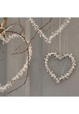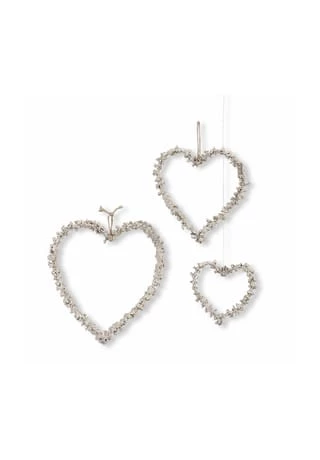 Festliches Trio. Von Hand geformt und verziert. Die filigrane Verzierung erstrahlt in gläzendem Finish. Ganz egal, ob Sie mit diesem charmanten Set Ihren Christbaum schmücken, es über den Kamin oder an die Haustür hängen – besinnliche Stimmung ist garantiert. Die Struktur der herzförmigen Anhänger entspricht filigranen Zweigen, die hübsch verziert sind. Das festliche Design wird durch charmante Jute-Kordeln zum Aufhängen perfekt abgerunden. Die handgemachten Anhänger lassen sich vielseitig kombinieren, zum Beispiel mit Kerzen oder LED-Girlanden.