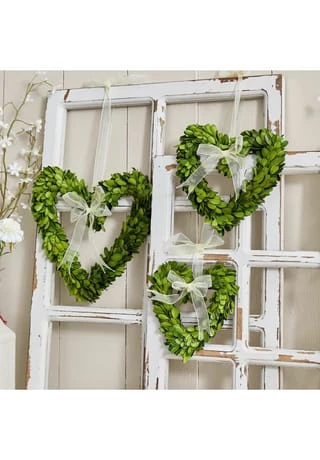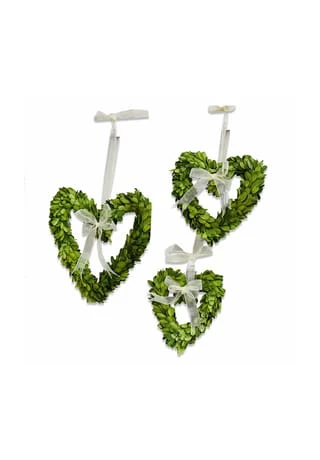 Der Deko-Klassiker in liebevoller Herzform. Drei unterschiedliche Größen laden zum Variieren ein. Das konservierte Buchsgrün strahlt auch auf Dauer eine natürliche Frische aus. Zeitlose Klassiker, die Ihnen zu den unterschiedlichsten Anlässen viel Freude am Dekorieren bereiten werden. Der immergrüne Buchsbaum ist haltbar konserviert und strahlt auch dauerhaft eine natürliche Frische aus. Ein dekorativ gebundenes Schmuckband rundet die stimmungsvollen Accessoires in Herzform ab. In drei verschiedenen Größen sind sie einzeln oder als Set einsetzbar und verleihen jedem Raum eine einladend herzliche Stimmung.