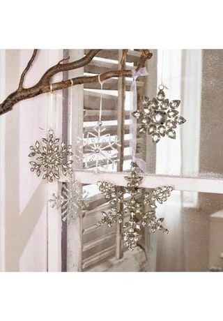 Vier glitzernde Schmuckstücke. Stern- und Schneeflockenform vereint. Mit glitzernden Glassteinen besetzt. Die Adventszeit und Weihnachten sind ohne Sterne und Schneeflocken unvorstellbar. Damit Ihre Festtage besonders ästhetisch werden, schmücken Sie Ihren Christbaum mit diesen wundervollen Anhängern, welche die Formen von Sternen und Schneeflocken ästhetisch verschmelzen. Aber auch an Zweigen oder hängenden Kränzen lassen die Kleinode aus glitzernden Glassteinchen Ihre Schönheit erstrahlen und sorgen für wunderbare Lichtreflexionen.