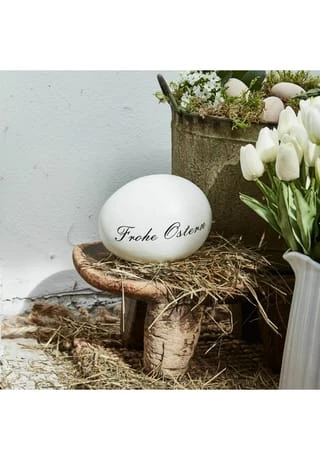 Wunderschön von Hand beschriftet. Nostalgische Anmutung. Polyresin-Design mit stabilem Stand. Dieses Deko-Ei rollt nicht weg. Dafür sorgt die ebene Unterseite. Dieses hübsche Deko-Ei wünscht mit romantisch geschwungener Schrift sehr charmant frohe Ostern – so wird das Fest doch gleich noch schöner. Dieses außergewöhnliche Design ist ein toller Schmuck für die Tafel und macht auch am Fensterbrett eine sehr gute Figur. Es lässt sich bestens mit weiterem Osterschmuck kombinieren und alle Jahre wieder aufstellen. Das süße Ei schmeichelt dem Shabby-Chic und zaubert in der Osterzeit ein Lächeln auf jedes Gesicht.