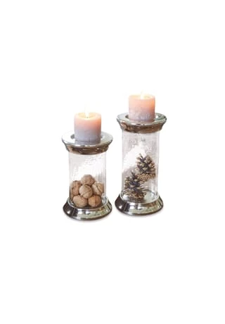 Elegantes Duo für individuelle Dekoration. Die Glaskörper können nach Belieben befüllt werden. Auf dem glänzenden Aluminiumteller nehmen Teelichter oder Stumpenkerzen Platz. Es geht einfach nichts über den romantischen Schein von Kerzenlicht. Mit diesem Set schaffen Sie das perfekte Ambiente für jede Gelegenheit. Das transparente, ungetönte Glas ist ideal, um es mit allerhand Deko wie etwa Blüten, Perlen, Tannenzapfen und ähnliches zu befüllen. Auf den hübschen Glaskörper wird dann ein glänzender Abschluss abgelegt, der Platz bietet für Teelichter oder Stumpenkerzen. Was dieses hochwertige Set ebenfalls auszeichnet, ist die zeitlose Eleganz des Designs. Es fügt sich perfekt in die unterschiedlichsten Interieurs ein.