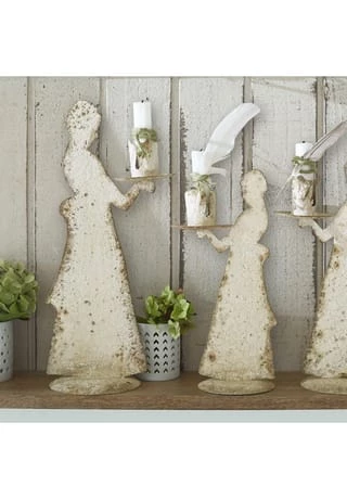 Stilvolles Shabby Chic-Trio. Aus Eisen mit Antik-Finish. Mit festem Sitz für Stabkerzen. Ist die Form dieser bezaubernden Kerzenständer der Silhouette einer Dame des 19. Jahrhunderts nachempfunden oder sind es die Umrisse einer Dienstmagd aus der Barockzeit? Sie sehen also: Das charmante Design ist nicht nur besonders stilvoll, sondern auch ein ausgezeichneter Konversationsstarter. Die unterschiedlich dimensionierten Kerzenständer sind aus hochwertigem Eisen gefertigt und mit einem aufwendigen Antik-Finish veredelt. Das ist quasi Shabby-Chic in Perfektion. Das Trio verleiht jedem Raum ein romantisches Vintage-Flair und auch einzeln platziert sind die Kerzenständer ein charmanter Blickfang.