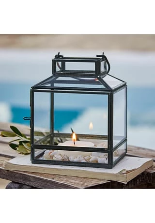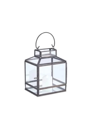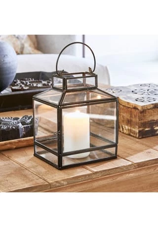 Hübsches Schaufenster für Kerzen und Deko. Aus Glas und Eisen gefertigt. Die schlichte Eleganz dieser Laterne ist mit den unterschiedlichsten Interieurs kompatibel. Diese minimalistische Laterne lässt den Schein des Kerzenlichts in den Vordergrund treten. Klarglasscheiben in unterschiedlichen Größen wurden in einen hochwertigen Rahmen aus filigranen Eisenstreben eingefasst. Das dezente Shabby-Finish sorgt im Kerzenschein für einen ganz besonderen Schimmer. Ein formschöner Griff erleichtert den Transport und erlaubt es zudem, die Laterne aufzuhängen.