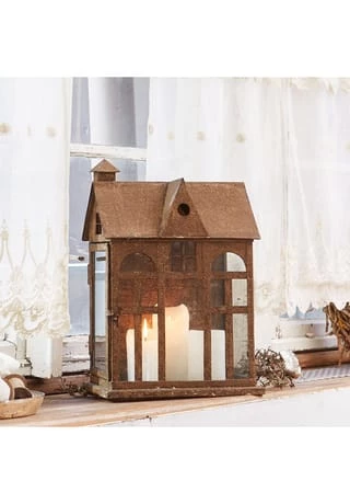 In Form eines Hauses gestaltet, überzeugt das eiserne Objekt mit hochwertig gearbeiteten Glaseinsätzen. Es ist seitlich zu öffnen und je nach Geschmack zu befüllen – ob mit ein paar Stumpenkerzen oder mit Stechpalme, Tannengrün und einer batteriebetriebenen Lichterkette.