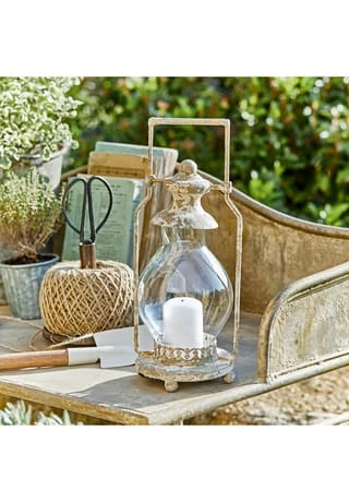 Das authentische Antik-Design wird von einem handgearbeiteten Finish perfekt abgerundet. Das Design begeistert mit feinen, handwerklich gearbeiteten Details. Perfekt für Kerzen oder LED-Lichter. Das Glas lässt sich kinderleicht herausnehmen. Diese Laterne wirkt wie ein wertvoller Dachbodenfund, der schon viele Jahrzehnte überdauert hat. Das handgearbeitete Finish und ein zeitlos klassisches Design verleihen dem hübschen Lichtspender seinen authentischen Vintage-Charakter. Charmante Altersspuren und feine Unregelmäßigkeiten sorgen zudem für echten Unikat-Charakter. Der gläserne Windschutz lässt sich selbstverständlich entnehmen, damit sie bequem eine Kerze oder ein LED-Licht platzieren können.