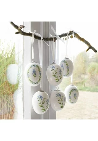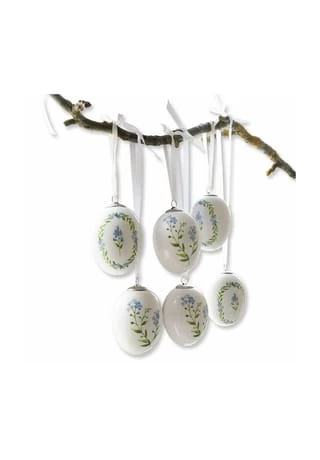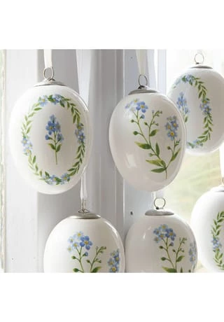 Kunstvoller Vergissmeinnicht-Druck. Sehr zart und romantisch. Stimmungsvolle Nostalgie auf Porzellan. Wie ein Kunstwerk aus der guten, alten Zeit – dieses reizende Set aus sechs Deko-Ostereiern entführt uns in eine vergangene Ära. Der stilechte Druck mit feinen Blüten und Ranken erinnert an Großmutters Garten und weckt schöne Erinnerungen. Die sechs Eier sind alle bereits mit einem passenden Band ausgestattet, sodass Sie gleich ein hübsches Plätzchen für Sie suchen können – vielleicht an grünen Zweigen oder einem Haken platziert. Hiermit kommt ein Hauch Shabby-Chic in Ihr Heim. Ein Vintage-Design, das fast zu schön ist, um nur zu Ostern zu glänzen.
