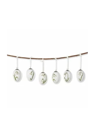 Kunstvoller Schneeglöckchen-Print. Feines Porzellan. Schön wie aus Großmutters Zeiten. Das reizende Set aus sechs Deko-Ostereiern entführt uns gedanklich in frühere Zeiten. Es erinnert an Erbstücke aus längst vergangenen Tagen und passt perfekt zum Shabby-Chic. Jedes Ei ist bereits mit einem passenden Band versehen, sodass Sie gleich mit der Dekoration anfangen können. Das zeitlose, florale Motiv ziert nicht nur zum Osterfest Ihr Heim – wer mag, kann sich ganzjährig daran erfreuen. Grüne Zweige, Wandhaken und mehr freuen sich auf diesen stimmungsvollen Schmuck im Vintage-Look.