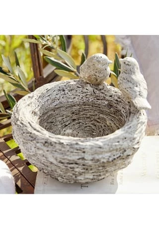 Sehr naturnah und detailreich. Süße Vögelchen und Nest aus Zement. Dekorativ und tierfreundlich. Die Vögelchen sehen ganz echt aus. Diese reizende Vogeltränke gibt Balkon und Garten nicht nur besonderen Charme, sondern erfreut auch die Tiere. Vögel, Bienen und andere Tierchen nehmen dankbar sauberes Wasser an und bevölkern dann freudig Ihre Oase im Grünen. Das schöne Design hat eine nostalgische Note und passt gut zum Shabby-Chic. Wer mag, könnte die Tränke alternativ auch zum Arrangieren dekorativer Dinge oder zum Aufbewahren von Schlüsseln oder Schmuck nutzen.