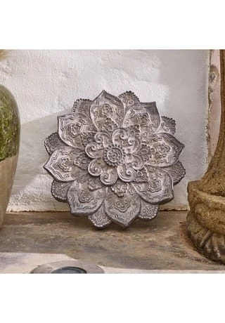 Handgearbeitete Mandala-Kunst. Detailverliebte Ornamentik. Die wunderschönen Muster und Raffinessen werden durch das handgemalte Finish noch unterstrichen. Als Mandala bezeichnet man ein kunstvolles geometrisches Muster, das im Hinduismus und Buddhismus eine magische oder religiöse Bedeutung besitzt. Es ist meist quadratisch oder kreisrund und stets auf das Zentrum fixiert. Dementsprechend wurde auch dieses bezaubernde Wandornament geformt. Verschwenderische Details und Raffinessen unterstreichen den hochwertigen Charakter dieses handgearbeiteten Wandschmucks. Dass es von Hand bemalt wurde, erkennt man bereits auf den ersten Blick.