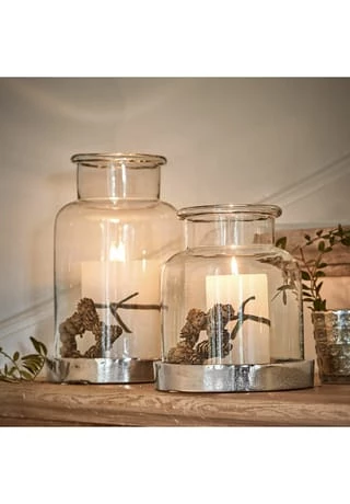 Zeitlose Eleganz in zwei Größen. Unten geöffnet zum einfachen Bestücken mit Kerzen. Aus klarem Glas und schimmerndem Aluminium. Romantischer Kerzenschein und ein Design, das wirklich jedem Ambiente schmeichelt. Die Dämmerung bricht herein, und Sie entzünden darin Kerzen – sofort wird der Moment eine Spur heimeliger und gemütlicher. Gute Gespräche mit Freunden oder ein Buch bei Kerzenlicht lesen, so verzaubern Sie ganz einfach den Abend. Das klare Design macht Ihnen lange Freude und lässt sich zu jedem Ambiente kombinieren. Ob Shabby-Chic, Landhaus oder Industrial-Stil, dieses attraktive Doppel ist zu jeder Jahreszeit und drinnen wie draußen ein Gewinn.