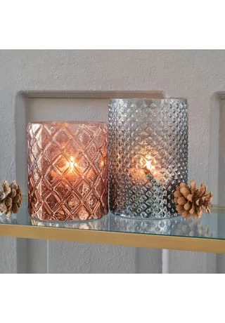 Aus reinem Glas mit besonderen Rautenprägungen. Zwei unterschiedliche Designs im Set. Unterschiedliche Tönungen sorgen für Kontrast und gleichzeitig für Harmonie. Dieses Set punktet mit zeitloser Eleganz und raffinierten Details. Es besteht aus zwei Windlichtern, die sich in ihrer Größe und Musterprägung des Glases unterscheiden. Das Rautenmuster reflektiert und bricht das Kerzenlicht auf besonders attraktive Weise. Selbstverständlich können Sie die gläsernen Schmuckstücke auch mit Deko-Material, frischen Schnittblumen oder getrockneten Pflanzen befüllen. Auch als Einweihungsgeschenk ist dieses elegante Duo sehr gefragt.