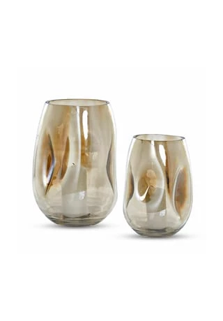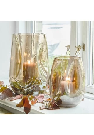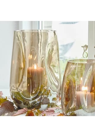 Fein schimmerndes Glas. Reizvolle asymmetrische Formgebung. Auch als Vase nutzbar. Ein Design mit spannenden und außergewöhnlichen Details. Die beiden schönen Windlichter weisen sanfte Einbuchtungen auf, was ihnen einen sehr künstlerischen und innovativen Look gibt. Perfekt für alle, die das Besondere lieben. Im Set erhalten Sie zwei Größen. Die beiden gläsernen Schmuckstücke zaubern gemütliches Licht, wenn darin Teelichter oder Stumpenkerzen entzündet werden. Wer kreativ werden möchte, könnte auch hübsche Dinge wie getrocknete Blüten darin sammeln, kleine Gegenstände in ihnen verwahren oder sie mit Blumen bestücken und als Vase nutzen.