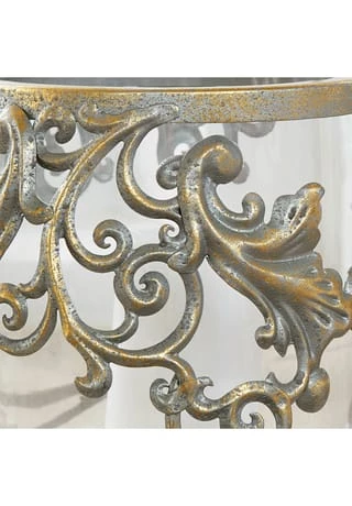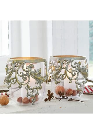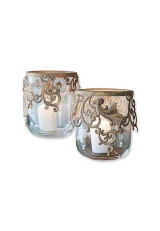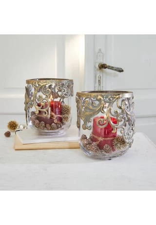 Romantisches Set aus Glas. Filigrane, florale Verzierungen aus Stahl, die auch abnehmbar sind. Mediterran inspiriert. Holen Sie die Schönheit vergangener Zeiten und goldenen Kerzenschein in einem zu sich. Das reich geschmückte und wunderhübsche Duo aus Glas ist der perfekte Begleiter hierfür. Stellen Sie einfach Teelichter ein und erfreuen Sie sich am Spiel von Licht und Schatten. Das reizvolle Design passt hervorragend zum Shabby-Chic und verschönert jede Saison. Wer möchte, könnte auch kleine Dinge in den edlen Windlichtern aufbewahren oder sie mit Mini-Zweigen und Blüten bestücken.