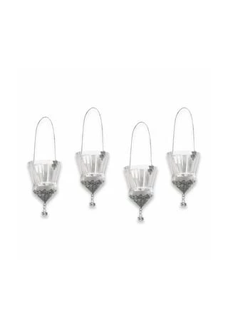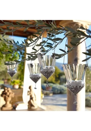 Aus klarem Glas gefertigt. Mit filigraner Aluminium-Deko an der Unterseite. Mit Metallaufhängung. Für je ein Teelicht geeignet.