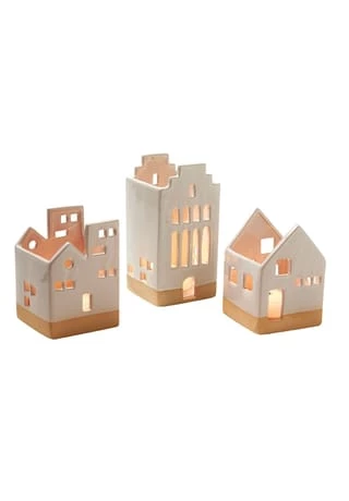 Drei bezaubernde Teelichthalter aus Keramik im Set. Jedes kleine Haus ist anders gestaltet und auch unbeleuchtet schon ein tolles Dekoobjekt – jeweils mit einem Teelicht beleuchtet kommen die Häuser aber besonders gut zur Geltung!